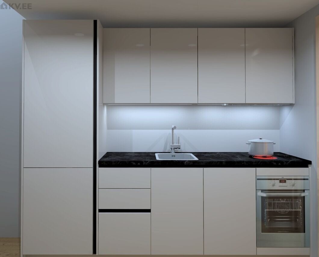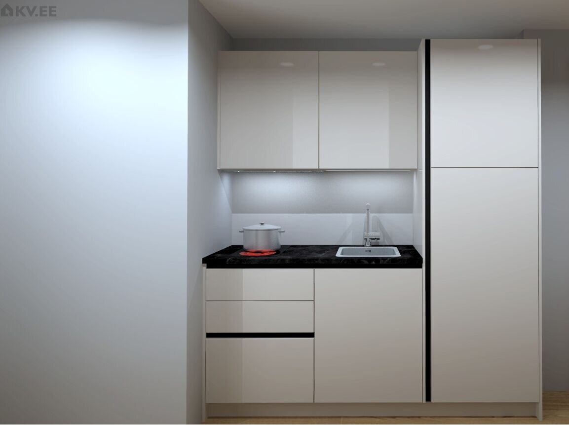 Avatud planeeringuga köök, standardlahendusega köögimööbel sõltuvalt köögi suurusest kuni 5000 € sisaldub hinnas. Võimalik leida koostööpartneriga standardist erinevaid lahendusi soodushinnaga. Pesumasina valmidus loodud.